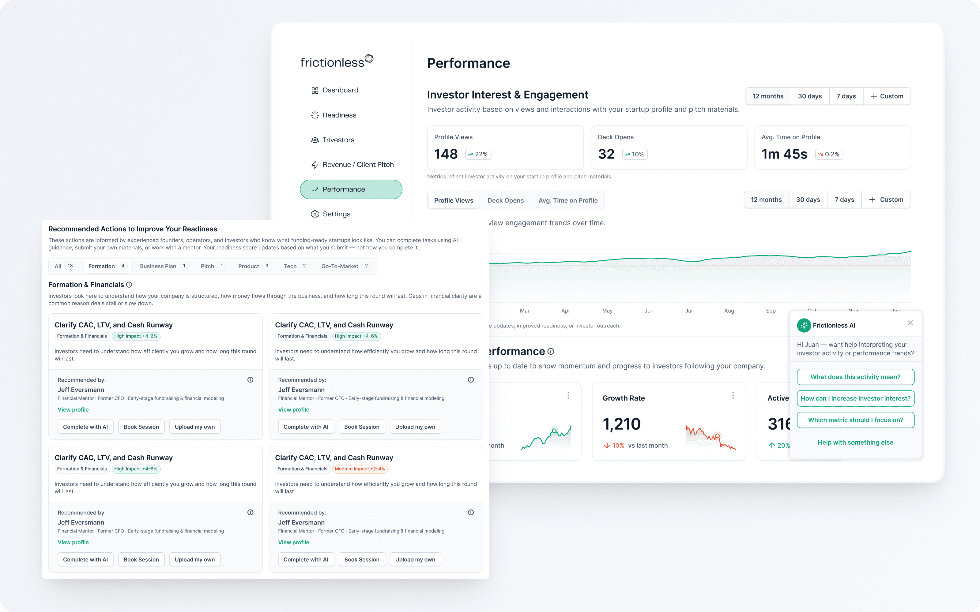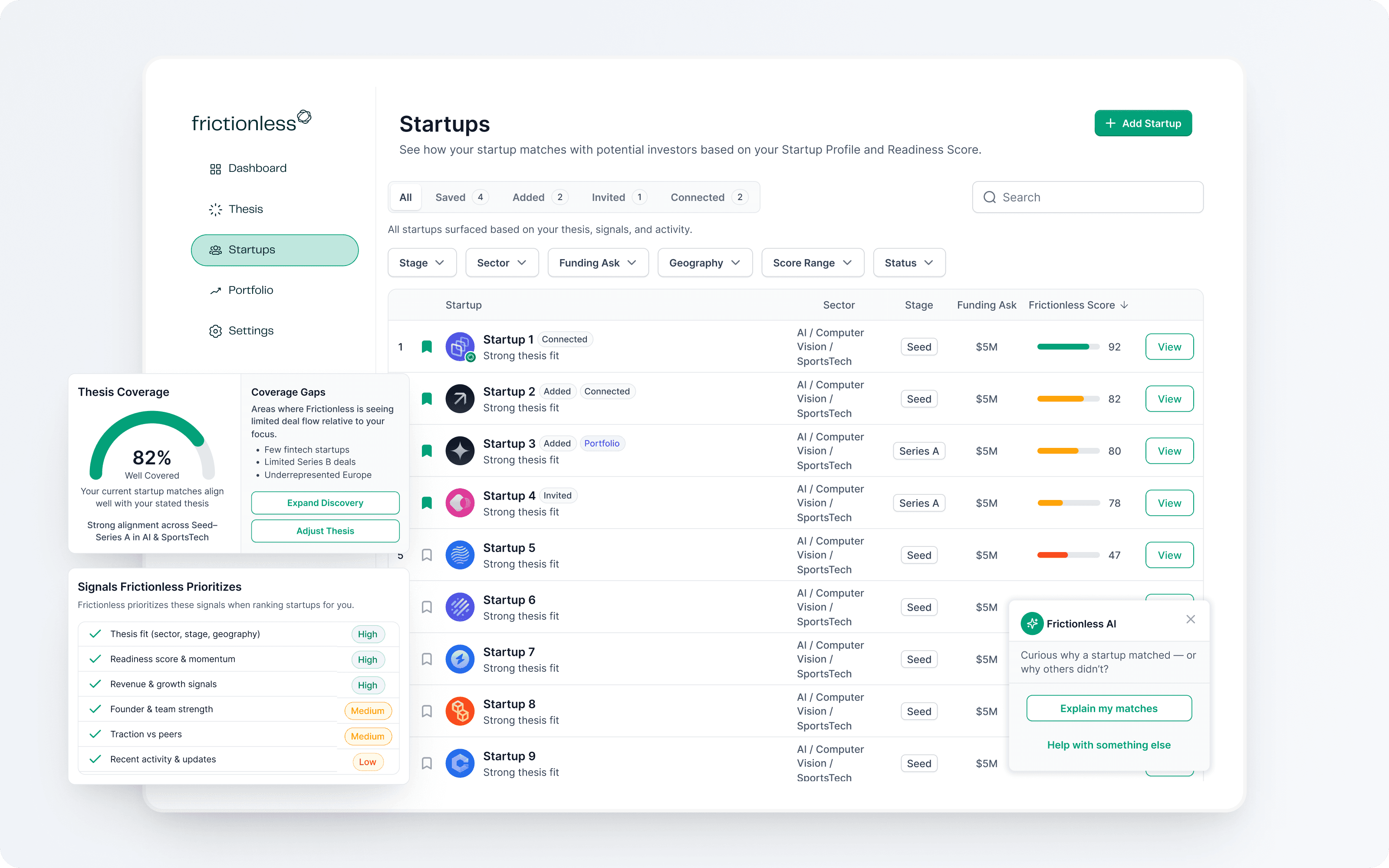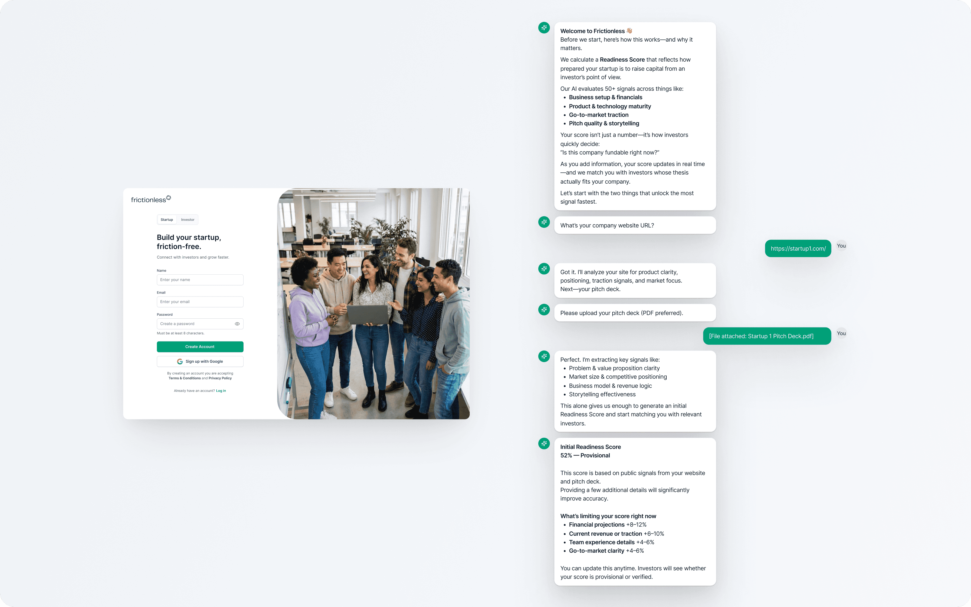 Frictionless is an AI-enabled capital intelligence platform designed to improve how startups are evaluated, matched, and supported across investors, funds, and accelerators.