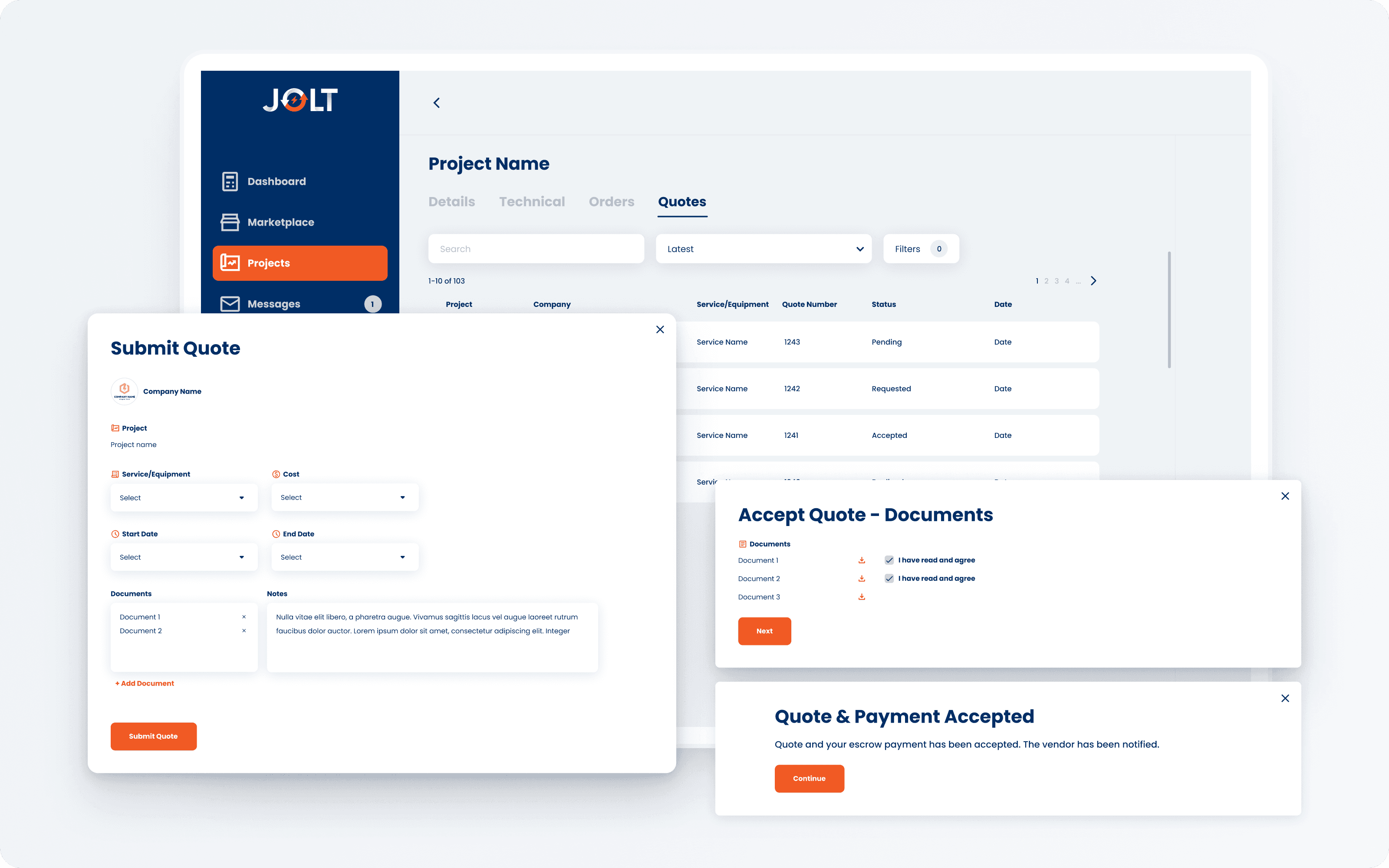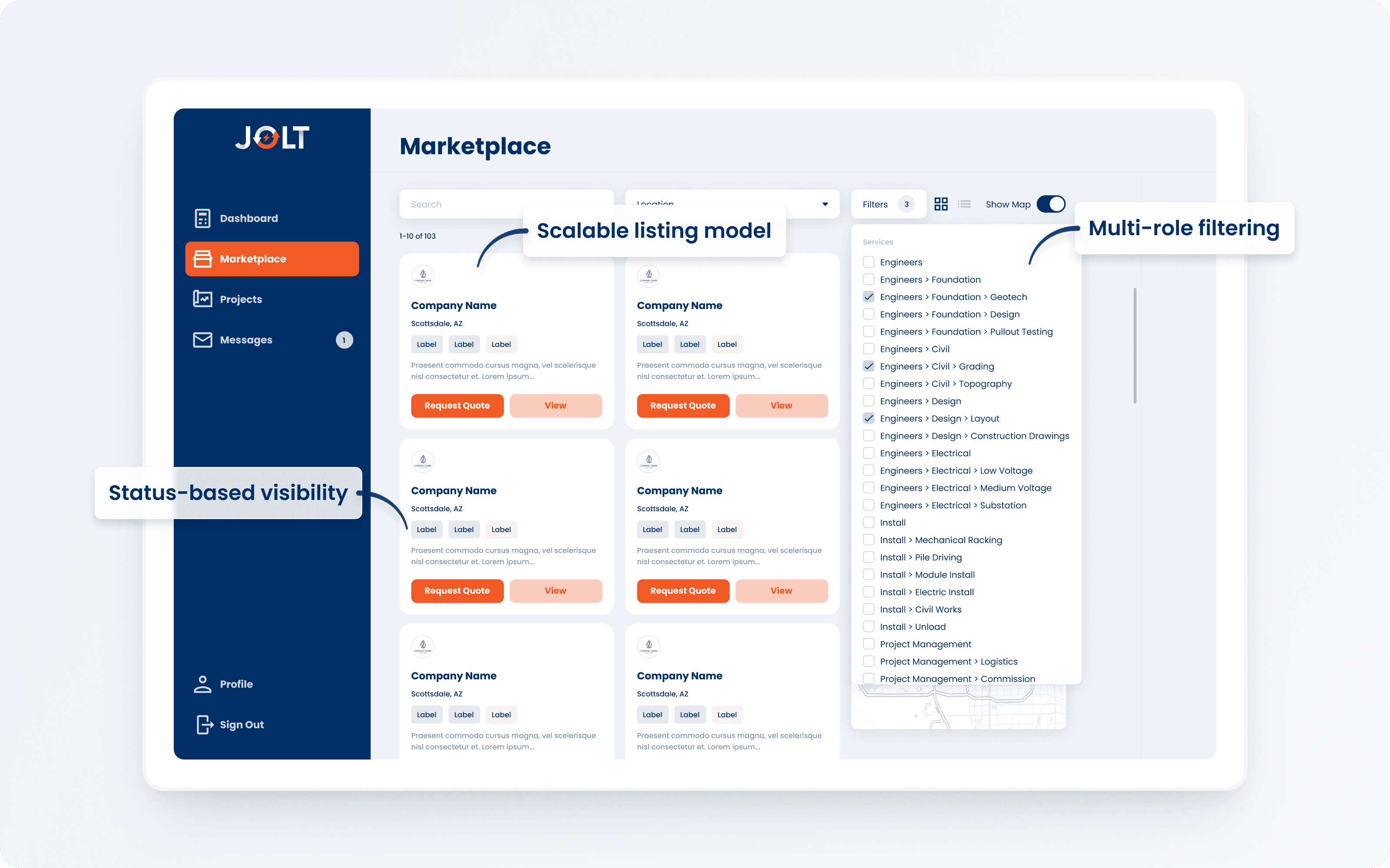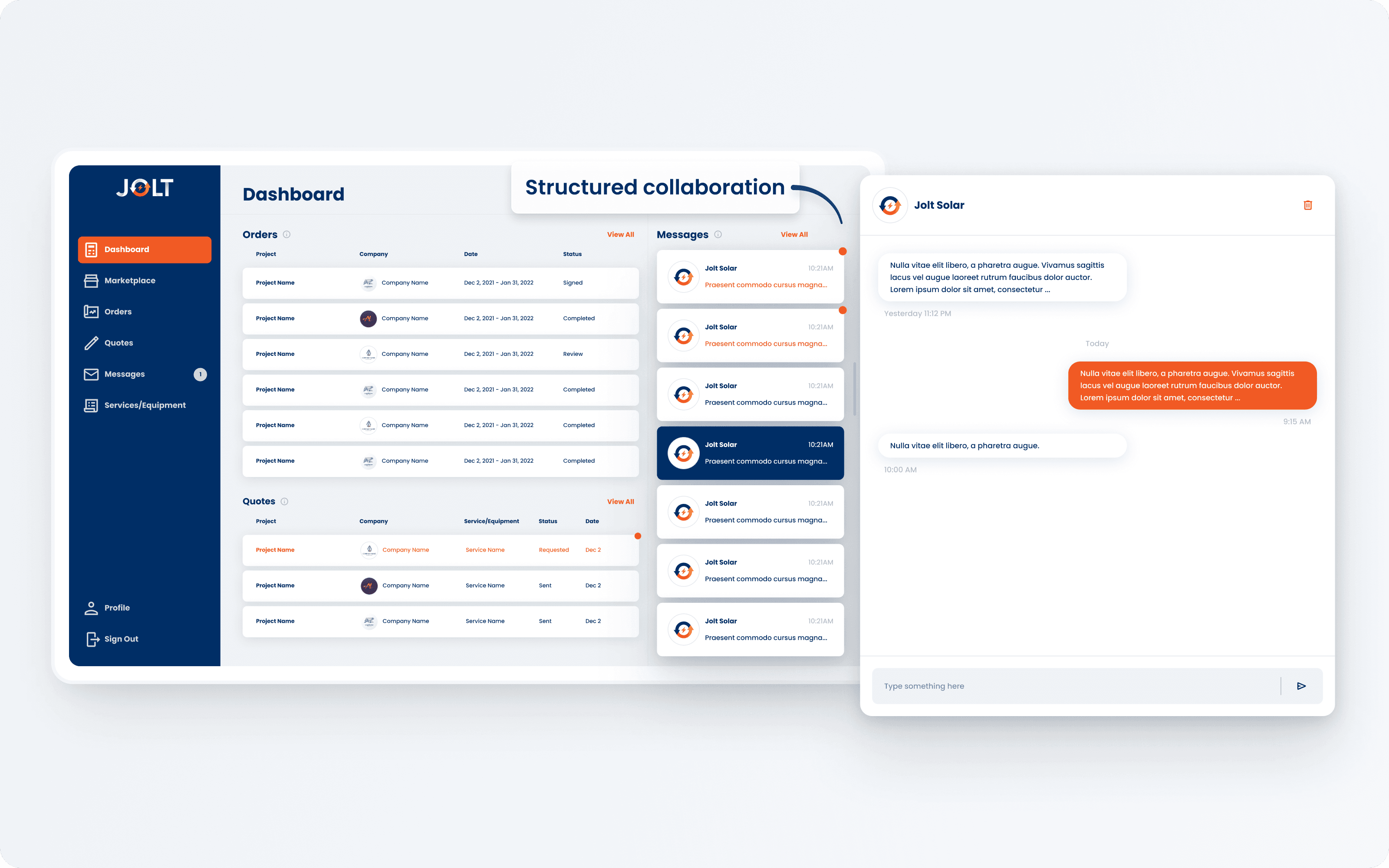 Jolt was designed to streamline coordination across the fragmented solar ecosystem by bringing installers, suppliers, and project stakeholders into a unified marketplace system.