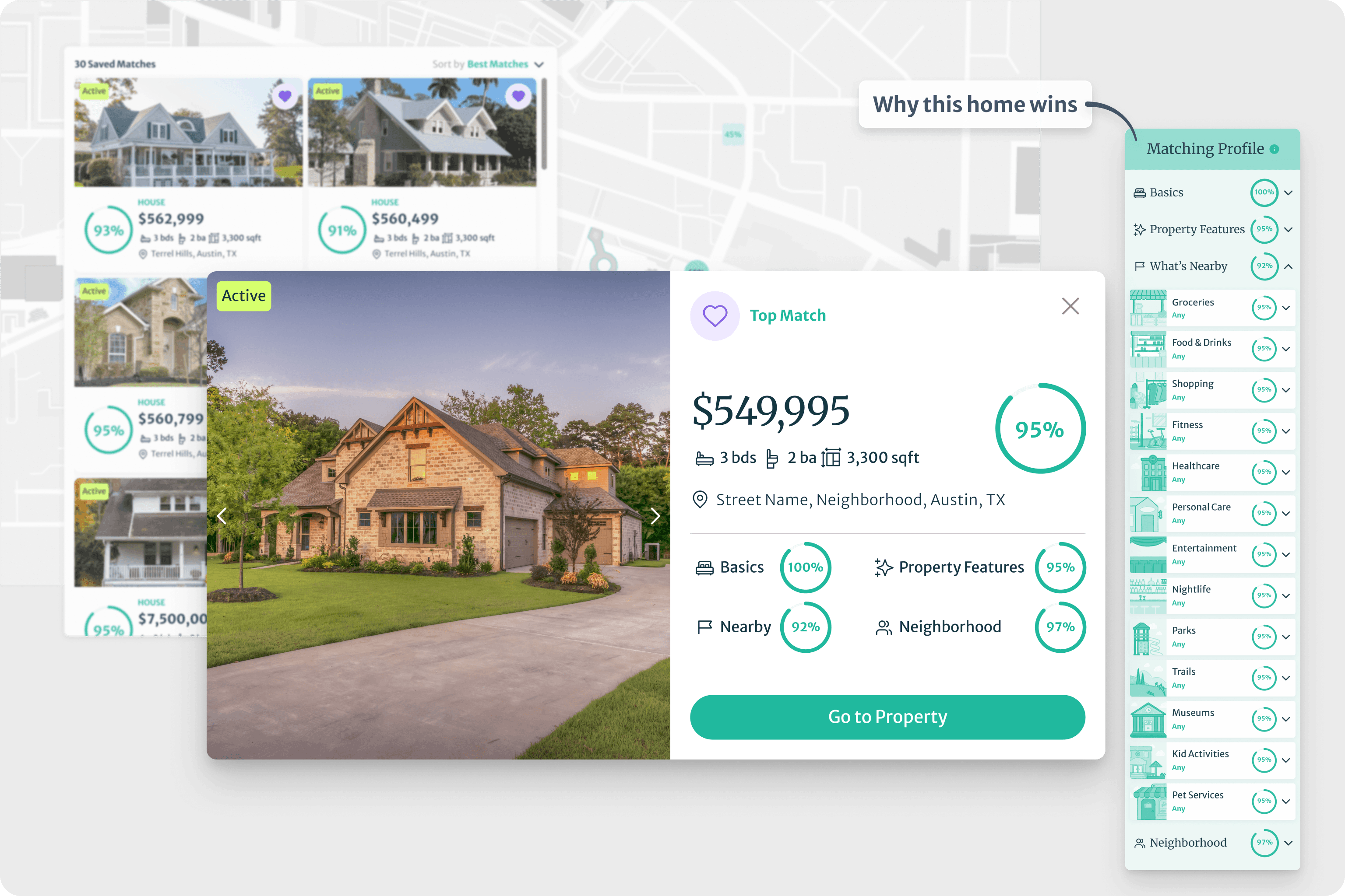 Designing for real estate agents as a parallel user, not an afterthought. Early in the project it became clear that buyers rarely navigate high-stakes home decisions alone — agents are almost always in the loop. Rather than designing purely for the end buyer and hoping agents would adapt, I architected the information model to be legible and useful to agents reviewing a client's HomeMatch profile. This meant the system needed to communicate not just recommendations, but the reasoning behind them in language an agent could use in a conversation with their client.