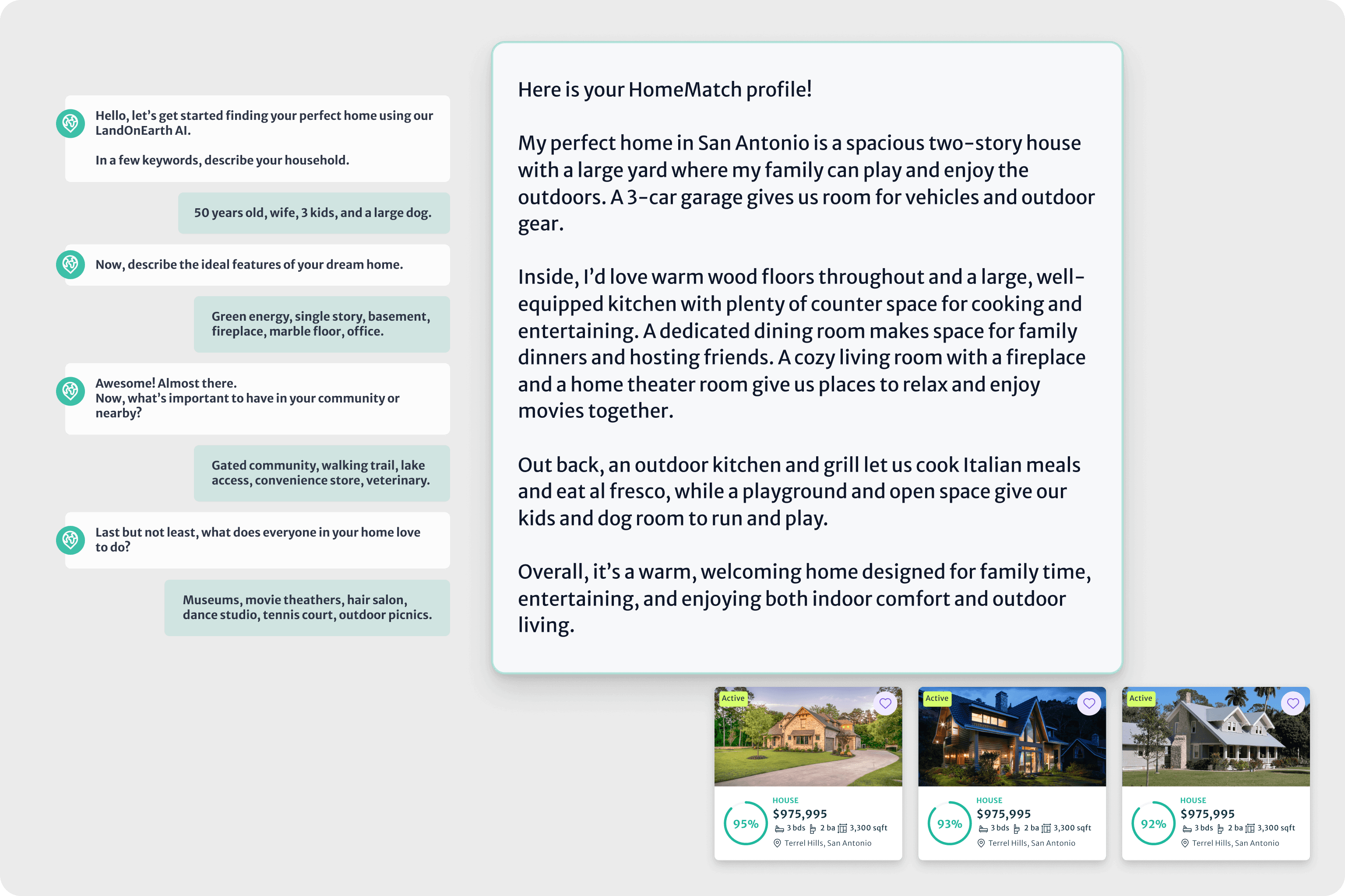 Conversational AI captures lifestyle, family, and activity preferences, transforming qualitative input into a structured HomeMatch profile that defines what “the right home” actually means for each user.